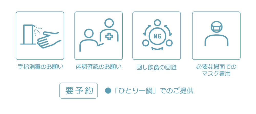 回し飲食は原則おやめください。必要に応じて料理の取り分けはスタッフでさせて頂きます。また博多炊き肉鍋用には取り分け箸をそれぞれにご用意しております。