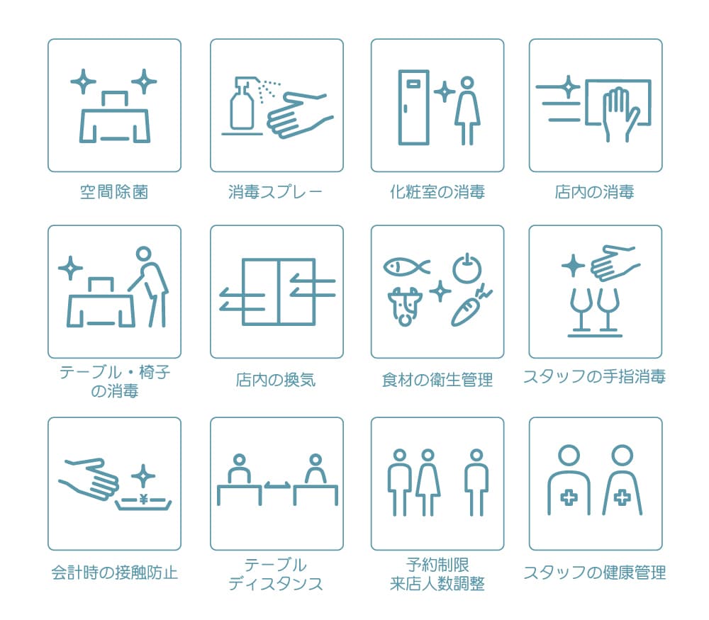 お客様の利用毎にテーブル・椅子・荷物置き等の消毒除菌を行っております。またテーブルクロスはお客様毎に清潔な新しいものに交換しております。