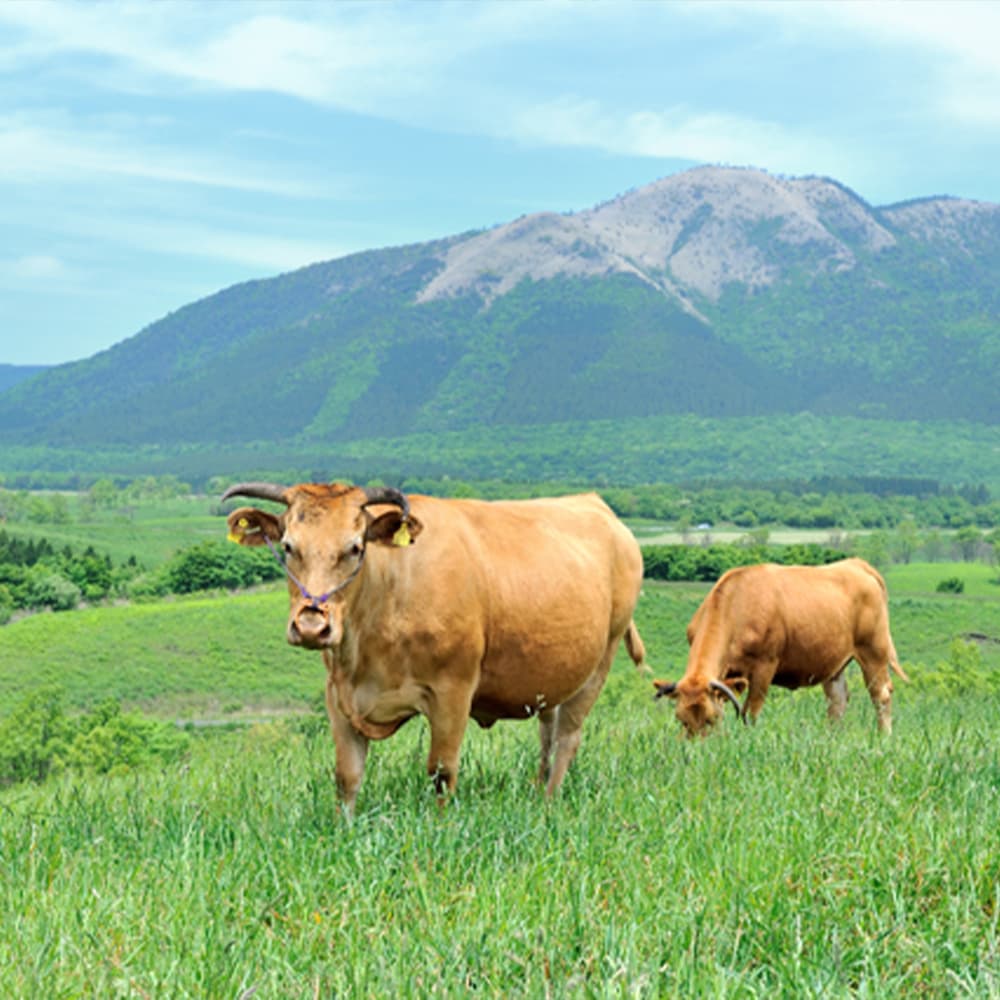 井さんのあか牛は、毎年5月頃にあか牛を放牧し、2月に牛舎に戻す「夏山冬里方式」で育てられます。放牧期間中は日に40~50kgもの牧草や野草を食べ、出産し健康な母乳で仔牛を育てます。冬の牛舎では、春に刈り取った栄養豊富な一番草や野草、藁の粗飼料を食べたいだけ与え、穀物や大豆が多く含まれる濃厚飼料は最小限に抑えています。このこだわりが、お肉の旨みと香りの由来となっています。そして、抗生物質やビタミン剤、ホルモン剤は一切投与しない。牛舎は名水・池山水源のすぐ近くにあり、ミネラル豊富な水も、美味しいあか牛が育つ理由の一つです。